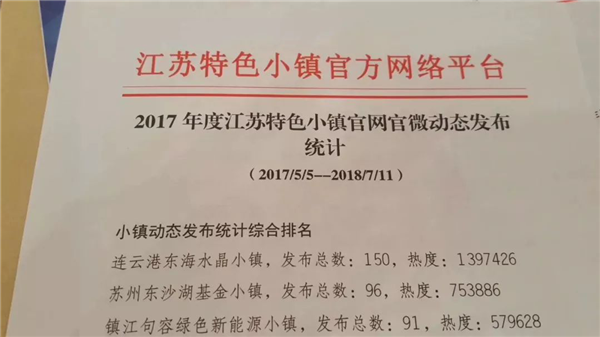 與此同時,在江蘇特色小鎮第四次創建工作推進會上,江蘇特色小鎮官方網絡平臺公布了動態統計數據(2017/5/5—20187/7),東海水晶小鎮新聞發布數量排名位居榜首,熱度排名名列第一。